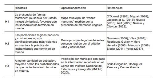 H1. La presencia de “zonas marrones”1 (ausencia del Estado), incluso simbólica, favorece que los linchamientos terminen en muerte. H2. Las poblaciones regidas por usos y costumbres no son significativamente más violentas en cuanto a la práctica de linchamientos que terminan en muerte. H3. A menor cantidad de población, mayores serán las probabilidades de que un linchamiento termine en muerte.