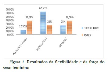 O presente estudo explorou os níveis de flexibilidade e de força muscular em pessoas jovens, saudáveis, e praticantes de CrossFit onde todos apresentavam um tempo mínimo de 6 meses de pratica da modalidade. O gráfico 1 mostra os resultados dos testes realizados na avaliação da flexibilidade e da força dos indivíduos do sexo feminino, onde pôde-se observar que os valores equivalentes a flexibilidade. A Figura 1 mostra os resultados dos testes realizados na avaliação da flexibilidade e da força dos indivíduos do sexo feminino, onde pôde-se observar que os valores equivalentes a flexibilidade foi de 12,50% (n=1) sendo classificada como pequena, 62,50% (n=5) foram classificadas como média e de 25% (n=2) como grande. Com relação a força foi observado que os valores de 37,50% (n=3) e 25% (n=2) correspondem a classificação fraca e boa respectivamente, e 37,50% (n=3) classificou-se como excelente com relação aos seus níveis de força.
