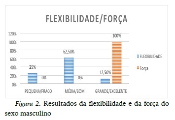 Na Figura 2 encontra-se os resultados obtidos do sexo masculino, onde 25% (n=2) apresentaram sua flexibilidade classificada como pequena, 62,50% (n=5) atingiram a média da escala do flexiteste e 12,50% (n=1) da amostra tiveram sua flexibilidade classificada como excelente. Os resultados referentes ao índice de força, foi observado que 100% (n=8) dos homens praticantes de CrossFit que participaram do estudo apresentaram seus níveis de força excelente.