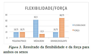 A Figura 3 exibe os resultados dos dois grupos, onde foi observado que 18,75% (n=3) da amostra total teve classificação referente a flexibilidade apresentada como pequena, 62,5% (n=10) classificada como boa e 18,75% (n=3) tiveram a flexibilidade classificada como excelente. Com relação a força 18,75% (n=3) foi classificado como pequena, 12,5% (n=2) como boa e 68,75% (n=11) do total conseguiram obter uma classificação apresentada como excelente para os níveis de força.