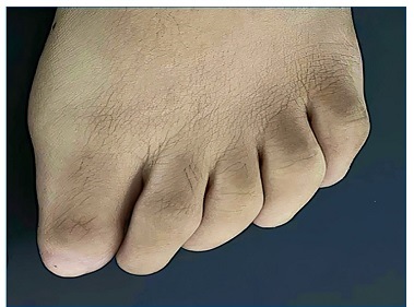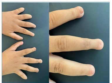 Physical examination revealed deformations in the fingers and toes, absence of nails and fifth phalanxes in some fingers (Figures 1 and 2 ), motor and speech difficulties, high palate, short stature, and unilateral hearing loss. Radiographic examination of the hands and wrists revealed that the patient presented a delay in bone age. On extraoral examination, facial features typical of the syndrome were observed, such as a bulbous nose, thick eyebrows, hypertrichosis, thick lips, and flattened nasal bridge (Figure 3).