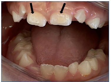 Intraoral examination revealed the presence of gingival hyperplasia in the upper arch and gingivitis associated with the presence of dental biofilm, arched palate, Angle class I occlusion without crossbite or open bite, dolichofacial pattern, labial hypotonia, and mild enamel hypomineralization (presence of whitish-cream demarcated opacities)14 in the permanent maxillary central incisors (Figures 4 and 5). Moreover, she had caries lesions in the deciduous mandibular left second molar and mandibular first permanent molar, which presented great coronary destruction and pulp involvement (Figures 6 and 7).