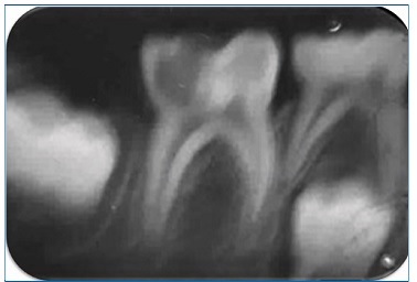No demarcated opacities, enamel breakdown, or atypical restorations were observed in the patient’s other first permanent molars. Still, the tooth extraction might have been due to molar incisor hypomineralization (MIH), based on the judgment criteria for MIH diagnosis proposed for prevalence studies, where one of the criteria to diagnose “Suspected for extraction due to MIH” is the absence of the first permanent molars in a sound dentition in combination with demarcated opacities on the incisors.15 Periapical radiography of the affected teeth was performed. Bitewing radiographs were impossible to make due to the patient’s uncooperative behavior and reduced mouth opening.