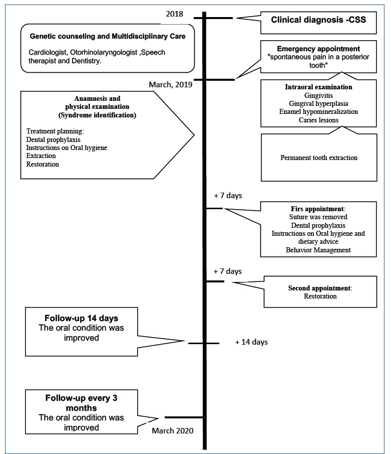 There is no report of dental care in a patient with this syndrome in the literature, making it difficult to compare the obstacles encountered and the protocols adopted in the present case report. CSS has a variable expression in different individuals.