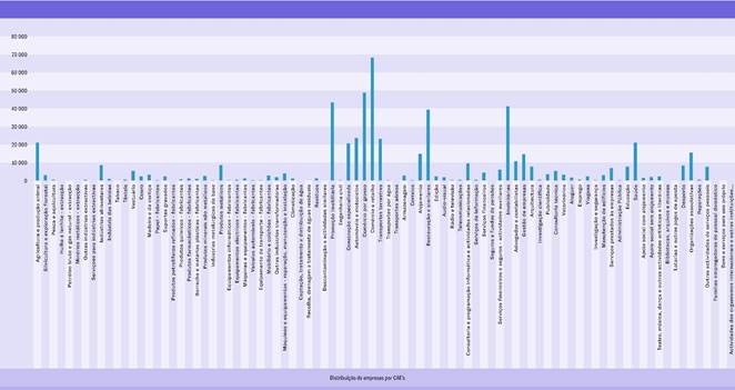 A caracterização do tecido empresarial português, permitiu compreender que este é vasto e integra um total de 586.818 empresas distribuídas por 88 Códigos de Atividade Económica (CAE) com 3 dígitos e 850 sub-CAE’S com 5 dígitos, conforme se apresenta no Gráfico 1. Distribuição de Empresas por Código de Atividade económica (CAE).