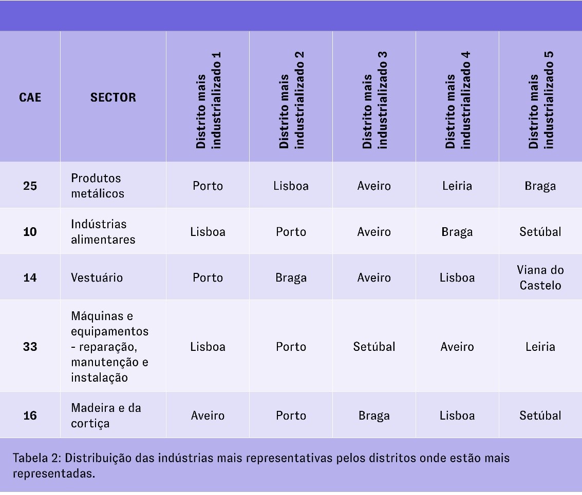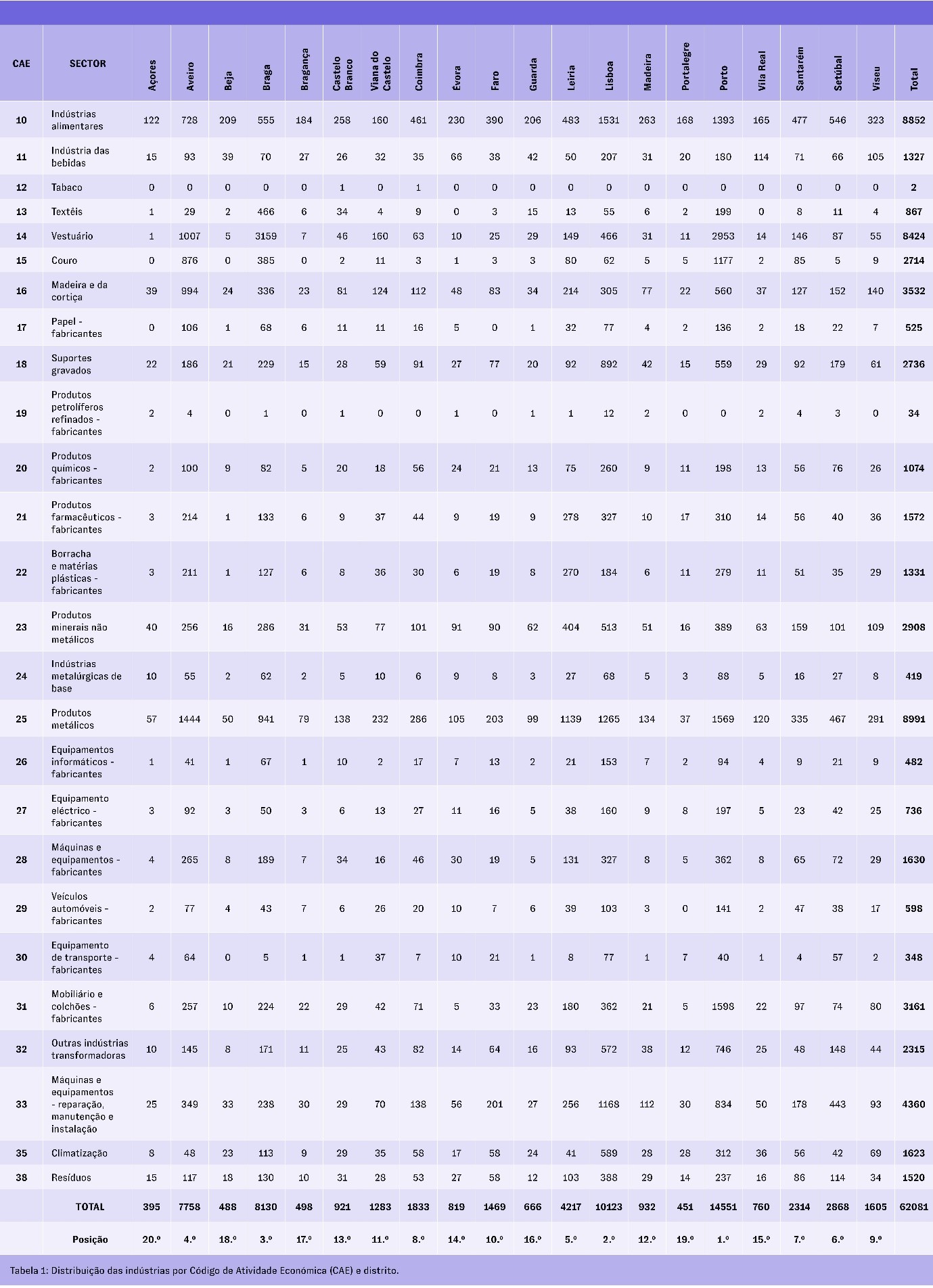 No que diz respeito ao tecido industrial português, este é constituído por um total de 62.081 indústrias, distribuídas por 26 Códigos de Atividade Económica (CAE), com uma distribuição por distrito que se apresenta na Tabela 2.