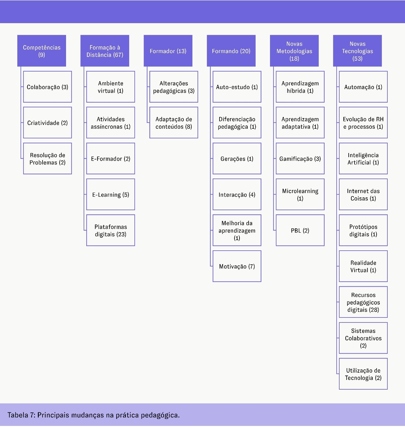 Na pergunta 18 “Quais a mudanças efetuadas na sua prática pedagógica associadas ao conceito de indústria 4.0 ?” verificamos que apenas 119 formadores/as detalharam especificamente que mudanças efetuaram. Da análise de conteúdos e categorização das respostas à pergunta aberta, identificamos maioritariamente 6 grandes categorias emergentes, (e apresentamos entre parêntesis as respetivas frequências) : Competências (9) ; Formação à Distância (67) ; Formador (13) ; Formando (20) ; Novas Metodologias (18) e Novas Tecnologias (53). Algumas das respostas dadas pelos/as formadores/as eram bastante mais detalhadas, permitindo a emergência de 30 subcategorias, organizadas pelas 6 categoria principais, como se pode verificar na Tabela 7. Principais mudanças na prática pedagógica.