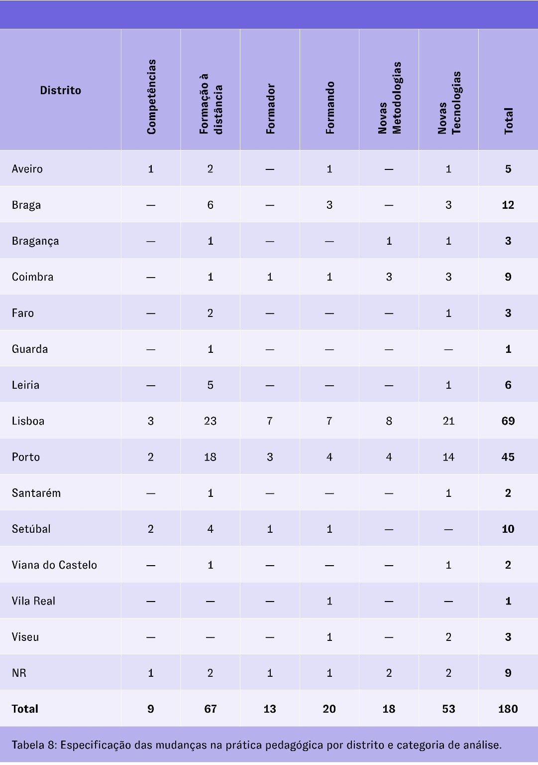 Quando cruzamos estas respostas com a variável território (distrito), verificamos novamente que é nos distritos de Lisboa (n = 69) e Porto (n = 69) que mais mudanças se reconhecem como tendo sido necessárias aos/as formadores/as, nomeadamente nas áreas de Formação à Distância (Lisboa : 23 e Porto : 18) e Novas Tecnologias (Lisboa : 21 e Porto : 14). De seguida, é o distrito de Braga que mais se destaca com 12 formadores/as a indicarem mudanças na sua prática pedagógica, sendo a categoria da Formação à Distância a mais relevante (6).