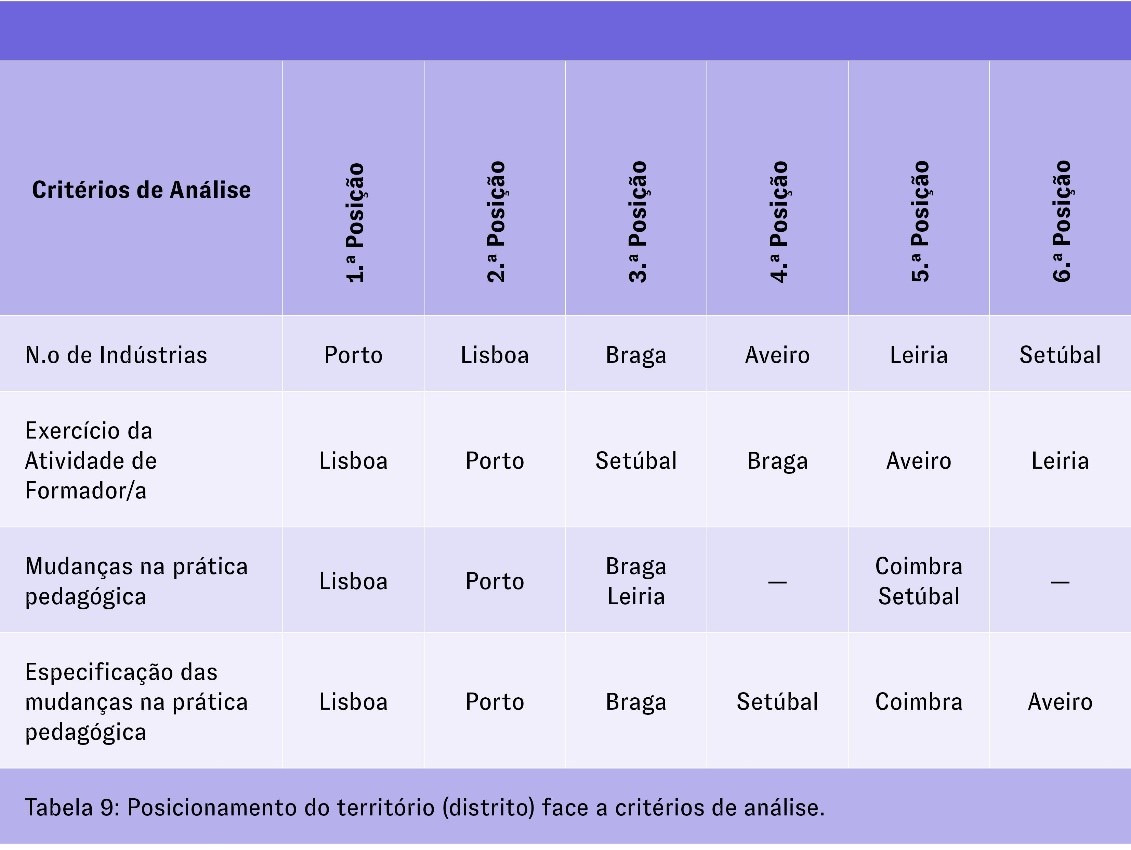 Contudo, a distribuição desigual de população pode explicar em parte por que motivo as mudanças nas práticas pedagógicas dos/as formadores/as continuam a acompanhar a mesma tendência de distribuição, mas é um claro sinal de alerta para a indústria portuguesa, que será a principal afetada pelas transformações decorrentes do desenvolvimento tecnológico e da digitalização. Especialmente se tivermos em conta a ausência dos restantes distritos da região norte no que diz respeito às mudanças nas práticas pedagógicas dos/as formadores/as, dado que estes representam mais de metade do n.º total de indústrias no país, mas tal facto pode ser explicado pela deslocação geográfica dos/as trabalhadores/as - formandos/as a outro distrito para receber formação, explicando por que motivo estes não têm uma expressão muito significativa nos critérios “Exercício de atividades de formador/a” e consequentemente no critério “Mudanças na prática pedagógica”.