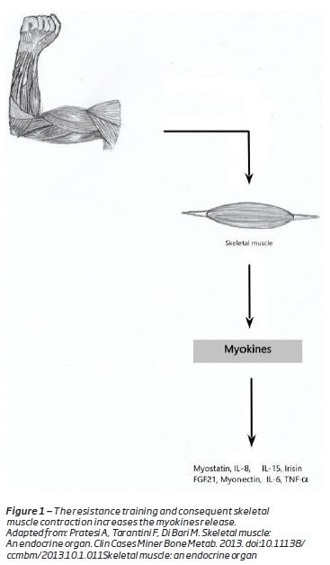 Skeletal muscle is nowadays understood as an endocrine organ(8,9). It has the capacity to produce hormone-like factor, called myokines, that influence metabolism and organs(8). Myokines have an autocrine, paracrine and endocrine actions(8). They have major implications on metabolic and other properties of muscle as well as distal organs(9). They are responsible for the protective actions of exercise(8) (Figure 1). The myokines release is the biological explanation for the metabolic and anti-inflammatory effect of exercise(1).