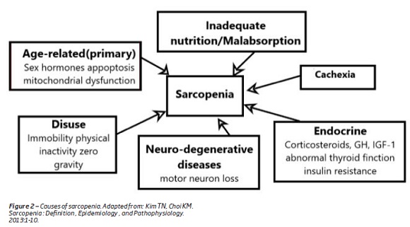 Other factors, such as nutritional deficiencies, insulin resistance, cigarette smoking, chronic lung disease, oxidative stress, inflammation and physical inactivity also contributes to sarcopenia (Figure 2)(5,14).