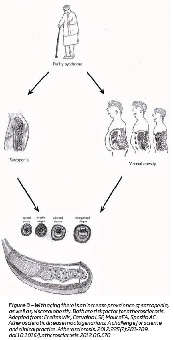 “Sarcopenic obesity” exacerbates even more the cardiovascular risk(20). A reduction in muscle mass results in lower total energy expenditure, leading to the development of visceral obesity(19,20). Visceral fat accumulation, rises the levels of inflammatory cytokines, increasing the skeletal muscle catabolism(7,20). The skeletal muscle mass decline, diminish the myokine secretion, increasing the inflammation and the insulin resistance(20). Combinations of these alterations in humoral factors might induce or increase oxidative stress(20). Oxidative stress is the key pathway in vascular endothelial damage, leading to the development of atherosclerosis(20).