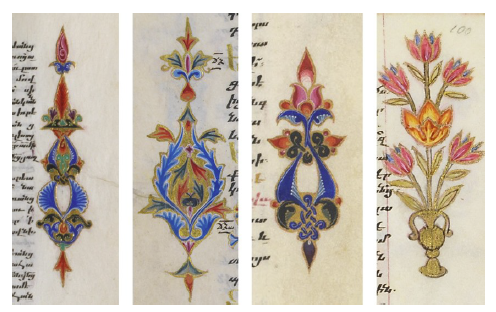 Fig. 2 Marginal ornaments in four manuscripts. From left to right: MS LA 152, Bible, p. 168; MS LA 193, Gospel, p. 112; MS LA 253, Gospel, fol. 55r; MS LA 216, Gospel, fol. 100r. © Museu Gulbenkian.