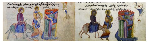Fig. 3 Flight into Egypt (detail). Left: MS LA 193, Gospel, seventeenth century (1647-1693), Crimea, p. 35. © Museu Gulbenkian. Right: Matenadaran MS 7651, Gospel, thirteenth century, Cilicia, fol. 26r. © Matenadaran Museum.