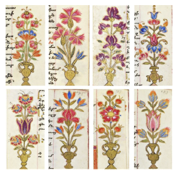 Fig. 4 Marginal ornaments in MS LA 216, Gospel, 1686, Isfahan (New Julfa), fols. 68r, 55r, 22v, 82r, 94v, 145r, 153r, 133r. © Museu Gulbenkian.