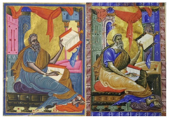 Fig. 5 Portrait of Evangelist Matthew. Left: MS LA 253, Gospel, seventeenth century, Constantinople, fol. 28v. © Museu Gulbenkian. Right: Matenadaran MS 2629, Gospel, thirteenth century, Cilicia, fol. 13v. © Matenadaran Museum.