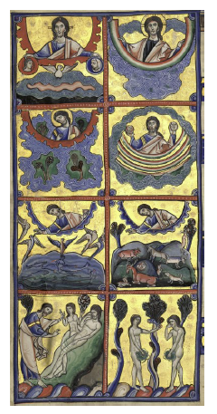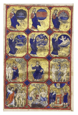 The page facing the Creation cycle in LA 152 is a fully illuminated title page of The Book of Genesis (p.14) with imagery of the Apocalypse. A lavishly ornated headpiece in the form of an arch occupies half of the title page. In this headpiece, Christ is portrayed in the central rosette, with a man on his left and a bird on his right side.