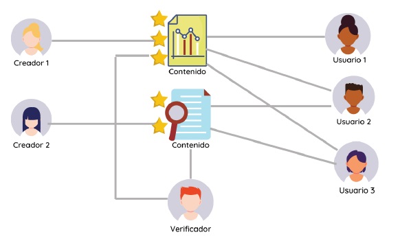 En este caso, existen dos creadores de contenido, en donde el verificador acepta su contenido para que pueda ser observado por los usuarios, estos usuarios envían una recompensa a los trabajos que consideran buenos y estas se acumulan sumando una buena reputación al autor del contenido.