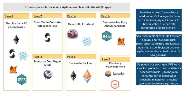 Se han definido 7 pasos (Jaramillo & Piedra, 2020), descritos en la figura 4, para la creación de una aplicación descentralizada. Estos pasos abarcan los temas más importantes para el desarrollo de estas.