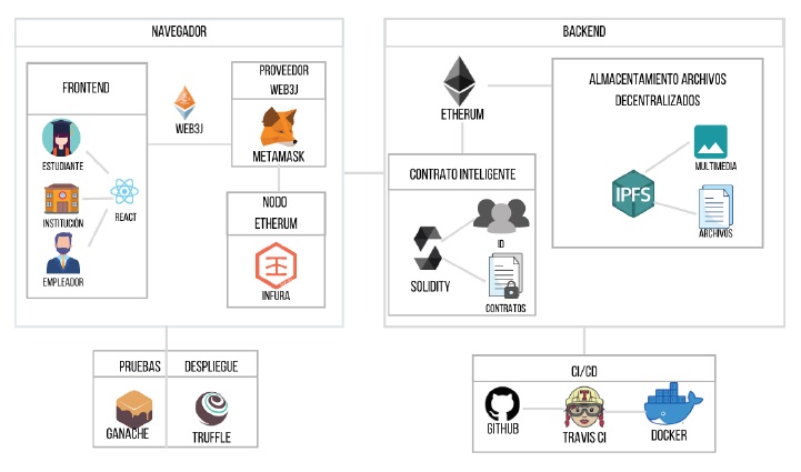 Se incluye también un componente de pruebas y despliegue, en donde se puede usar una BC local con la ayuda de Ganache para probar la aplicación antes de que entre en operación, y usar Truffle para la migración y complicación de los contratos inteligentes.
