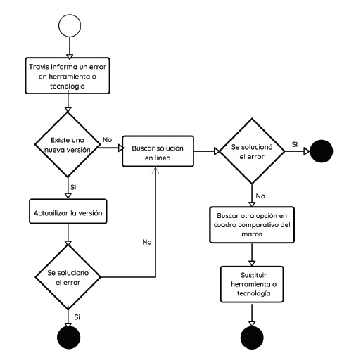 En primer lugar, se presenta una situación donde se produce un error, para esto hay que verificar si un cambio de versión resuelve el problema. Sino se debe buscar una solución online, en la arquitectura se buscó herramientas que tengan soporte y comunidad de usuarios para procurar que existan soluciones a errores. Por último, se recomienda cambiar la tecnología en el caso de que no se encuentre soluciones en los pasos definidos anteriormente.
