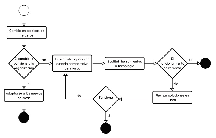 La gran parte de herramientas y tecnologías creadas como apoyo para las aplicaciones descentralizadas son de código abierto y es una política que estas aplicaciones promueven. Sin embargo, pueden existir cambios en políticas que deben ser analizados por las instituciones. La figura 8 presenta un flujo de cómo actuar en estos casos.