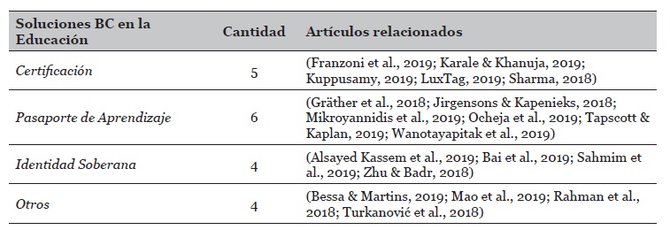 Como resultado de las soluciones que la tecnología BC ofrece, se destaca la certificación académica, la identidad soberana y los pasaportes de aprendizaje, además, se comparó algunas cadenas de bloque existentes que se encuentran en el mercado y va aumentado su popularidad.