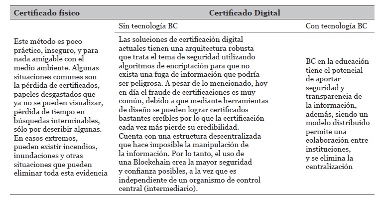 En este contexto, la tecnología BC puede transformar el proceso de emisión de certificados, creando datos enlazados que se encuentren encriptados, disminuyendo así el fraude académico debido al que existiría un proceso de verificación confiable. Las cadenas de bloques se pueden usar para almacenar hashes criptográficos ("huellas digitales") de los certificados, o para almacenar las propias reclamaciones. Por lo tanto, una cadena de bloques puede asumir la función de un registro de certificado público (Camilleri & Grech, 2017).