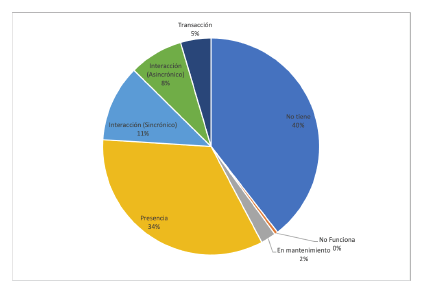 En estos sitios web ubicados en el nivel interactivo se encontró, por un lado, plataformas interactivas con funciones básicas de comunicación de tipo asincrónica como lo son: el correo electrónico, formularios y/o blog, pero en contra parte, hay otros sitios web que a pesar de contar con estas mismas funciones de comunicación, adicionalmente también cuentan con otras alternativas de comunicación de tipo sincrónica como: chat integrado en la plataforma, redes sociales como: Facebook y WhatsApp, entre otros elementos. Por lo tanto, al tipificarlas con base en los modelos de niveles madurez de e-gobierno expuestos en la literatura actual y que presentan entre 3 y 5 etapas (Almuftah, et al, 2016; Lee, 2010; Zahran, et al, 2015), es posible evidenciar una importante divergencia que pone de manifiesto lo expuesto por Patergiannaki y Pollalis (2022) quienes identificaron la necesidad de ampliar estos modelos de madurez de e-gobierno, los cuales explican son deficientes porque no profundizan con sub-niveles o sub-categorías que permitan definir con más detalle las funcionalidades de estas plataformas y ampliar con ello la visión del estado que tienen.