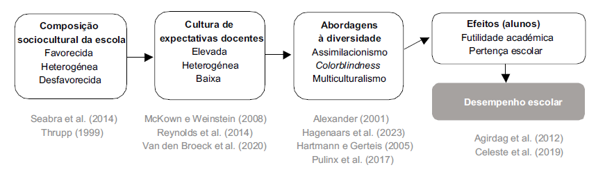 Um dos fatores unanimemente reportados para explicar o sucesso inesperado destas escolas é uma cultura assente em expectativas académicas elevadas para os seus alunos (Reynolds et al., 2014). Nesta área, encontra-se em emergência um corpo de literatura promissor, que problematiza as “abordagens à diversidade” predominantes nos estabelecimentos de ensino. Há indícios de que, em escolas onde o corpo docente se encontra mais aberto à adoção de princípios e práticas multiculturais / pluralistas - i.e., que consideram a diversidade cultural e étnica dos alunos como uma mais-valia educativa e o ponto de partida para a aprendizagem -, os descendentes de imigrantes têm classificações superiores, face aos seus pares que estão em escolas onde predomina uma abordagem assimilacionista, i.e., que perspetiva a diferença cultural como um obstáculo à aprendizagem e privilegia a adoção da cultura dominante (Celeste et al., 2019; Hagenaars et al., 2023). Por outro lado, é possível que a adoção de abordagens pluralistas esteja parcialmente dependente do “equilíbrio étnico” verificado na escola: a preferência dos docentes por abordagens monolingues à diversidade migratória é maior em escolas com composições étnicas equilibradas, mas menor em escolas com menos de 40% ou mais de 60% de alunos com origens imigrantes (Pulinx et al., 2017). Na literatura sobre os impactos educativos das várias abordagens à diversidade, a forma de multiculturalismo que aparece associada com a diminuição das desigualdades étnicas no desempenho escolar é aquela que mais se aproxima da definição de “pluralismo interativo”, avançada por Hartmann e Gerteis (2005). Apesar de apresentar algumas semelhanças com a ideia leiga de interculturalidade, ela vai além da promoção do diálogo e da compreensão entre culturas que se reconhecem como distintas. Numa escola multicultural, “(…) a ordem moral substantiva é entendida como sendo emergente - não algo que ‘é’, mas algo num estado de permanente concretização.” (Hartmann & Gerteis, p. 233). Apesar da ênfase grupal desta abordagem, os grupos culturais não são entendidos como fixos e imutáveis, mas antes como parte do tecido vivo da escola, mutuamente alterados. Assim, a eficácia de uma abordagem educativa multicultural assenta, em larga medida, na transformação da “ordem moral” da escola - nomeadamente, do seu “currículo”, no sentido de o tornar culturalmente significativo para todos os alunos. Evita-se, assim, a geração entre os alunos de um “sentido de futilidade” face ao trabalho académico (Agirdag et al., 2012), que emerge do fosso entre a cultura de origem dos alunos e aquela que é valorizada pela escola.