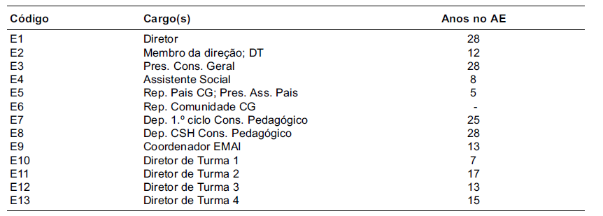 Foram realizadas 13 entrevistas semi-diretivas junto a docentes e lideranças da escola (Tabela 1). Alguns dos indivíduos foram selecionados a priori, dada a relevância do seu cargo na organização escolar (ex.: o Diretor). Noutros casos, pediu-se indicação à Direção de pessoas com quem poderíamos ter interesse em falar, pelo seu conhecimento do contexto (ex.: membro do Conselho Pedagógico). No caso dos diretores de turma, foram entrevistados todos aqueles que desempenharam essas funções em turmas de 5.º e 6.º ano entre 2014/15 e 2017/18. O guião de entrevista foi estruturado à volta de cinco dimensões: caracterização do agrupamento; gestão estratégica; corpo docente; organização e estratégias pedagógicas; clima de escola. Em cada uma destas dimensões, foi explorada a dimensão do sucesso escolar e das desigualdades étnicas e sociais.