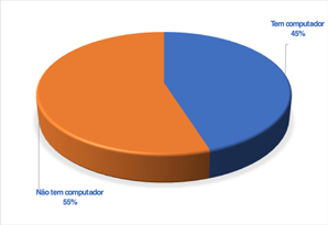 Relativamente à utilização de computador em casa - computador portátil ou de secretária - por parte dos alunos, os resultados demostram que a maioria, 55% (correspondente a 44 dos respondentes) referiu não possuir um computador em casa, e apenas 45% (correspondente a 36 dos participantes) responderam possuir um computador em casa.