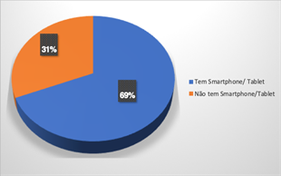 No que diz respeito ao acesso aos dispositivos móveis - smartphone e tablet - em casa dos alunos, o que já era expectável - o mundo está cada vez mais móvel e híbrido -, a grande maioria, 69% (correspondente a 55 dos participantes) respondeu ter acesso a, pelo menos, um destes dispositivos. Ainda assim, o número de respondentes sem acesso a um destes dispositivos móveis, 31% (correspondente a 25 alunos) é alto (gráfico 4). Estabelecendo uma relação entre o gráfico 3 e gráfico 4, verifica-se que 86% (correspondente a 69 dos alunos) tem acesso a um equipamento TIC: computador, smartphone e tablet.