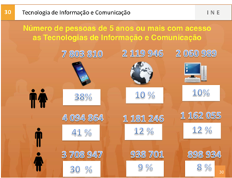 Para que a educação online se possa realizar, é necessário que se tenha acesso aos recursos TIC ligados à internet. Nesse sentido, faz-se, para um melhor entendimento, as seguintes constatações, em Angola: a taxa de pobreza nacional era de 40,6% (INE, 2020); a taxa de desemprego na população com quinze (15) ou mais anos de idade foi estimada em 32% (INE, 2020); sobre o número de pessoas com acesso às TIC (figura 1), 7 803 810 (38%) tinham acesso ao telemóvel, 2 119 945 (10%) tinham acesso à internet e 2 060 989 (10%) tinham acesso ao computador (INE, 2014).