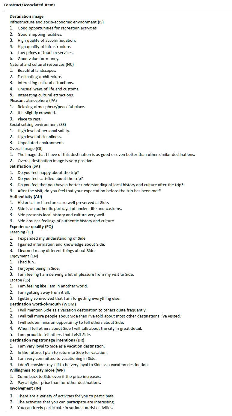 This research aims to analyse the effects of authenticity and involvement on destination image, shedding light on tourists’ perceptions. Destination image components, including infrastructure, socio-economic environment, natural and cultural resources, atmosphere, and overall image, are conceptualised for examination. Thus, destination image can be expressed as an attitudinal structure consisting of intellectual/perceptual, sensory and general image, which is a total summary of the ideas, beliefs and impressions that people have towards a certain area (Baloglu & McCleary, 1999; Stylidis, 2016). Destination image can be the visitor’s objective perception of the reality of the destination (Chen & Tsai, 2007). The study was conducted in Side, located in Antalya, an internationally renowned beach heritage destination. Side boasts significant historical sites and natural wonders such as sandy beaches, coastal forests, rivers, and archaeological sites. However, rapid and unplanned development since the 1990s has led to concerns about damage to archaeological sites and landscapes (Gezici, 2006; Brodie et al., 2011). Consequently, the study’s findings offer practical insights to local administrations to develop sustainable tourism policies and stakeholders to better understand tourists’ needs and preferences.