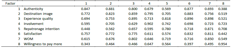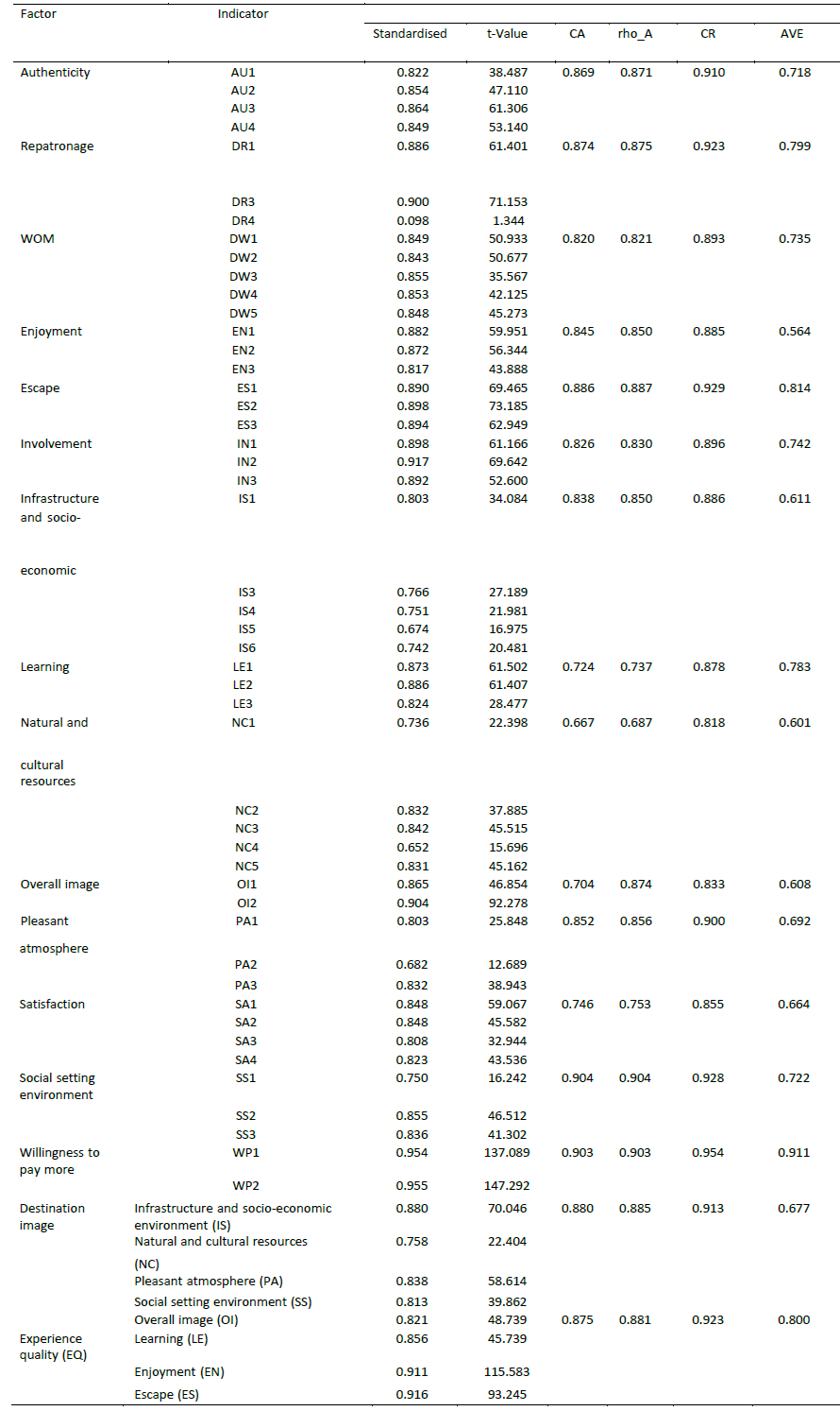 The scale items were adopted from prior studies and rated on a seven-point Likert scale (see Table 1). Destination image was adapted from García et al. (2012). Authenticity, involvement, and satisfaction were assessed using Lu et al.’s (2015) scale. Experience quality was operationalised using the three first-order dimensions: enjoyment, escape, and learning, proposed by Altunel and Erkut (2015). Word-of-mouth and re-patronage intentions were measured using Sirakaya-Turk et al.’s scale (2015). Willingness to pay more was adapted from Bigné et al. (2008).