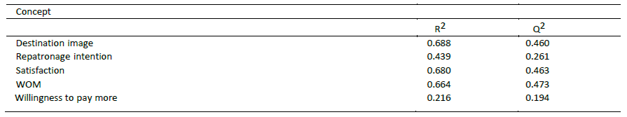 Based on R2 values of the structural model, the highest rate of destination image was 69%, and the lowest rate of willingness to pay more was 22%. These findings demonstrate that the disclosure rate of the study variables had a high and medium level of disclosure (Henseler et al., 2014).