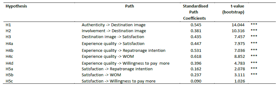 Boostrapping was completed with individual sign changes of 5,000 samples to determine parameter significance. As seen in Table 6, the results show that authenticity has a significant and positive influence on destination image (H1; β = 0.54; p < .01). Likewise, involvement has a significant and positive influence on destination image (H2; β = 0.38; p < .01). Besides, destination image has a significant and positive influence on satisfaction (H3; β = 0.43; p <.01) and similarly experience quality has a significant and positive influence on destination image (H4a; β = 0.45; p < .01). Experience quality has a significant and positive influence on re-patronage intentions (H4b; β = 0.53; p < .01), WOM (H4c; β = 0.62; p < .01) and willingness to pay more (H4d; β= 0.4; p < .01). Satisfaction has a significant and positive influence on re-patronage intentions (H5a; β = 0.16; p < .01) and WOM (H4a; β = 0.24; p < .01). However, it has been demonstrated that satisfaction has no significant effect on willingness to pay more (H5c; β = 0.09).