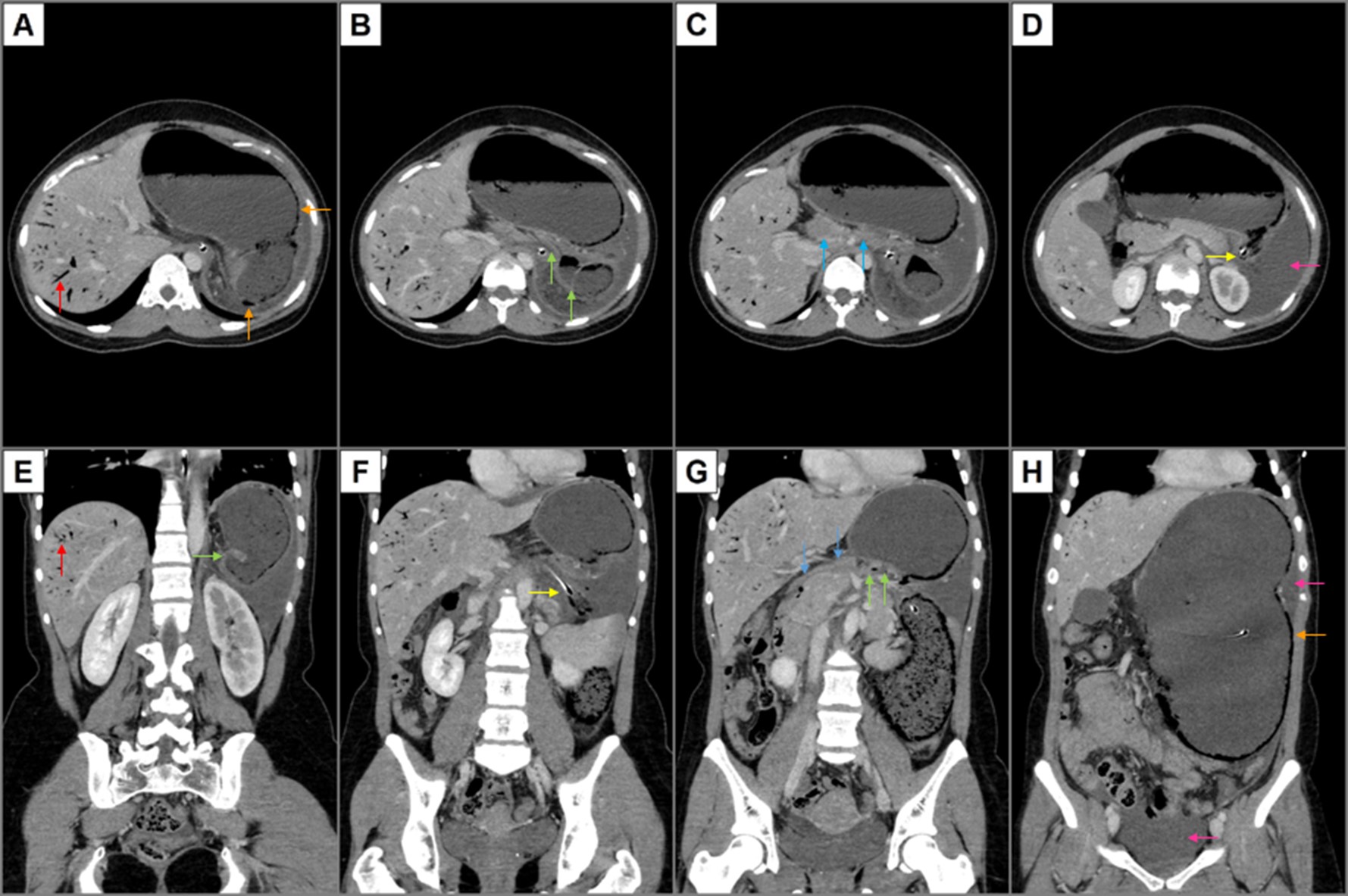 Figura 1: TC abdominal e pélvica - Cortes axiais - de superior para inferior (A-D) - e coronais - de posterior para anterior (E-H) - de TC abdominal e pélvica revelando significativa distensão e alteração da posição do estômago com inversão da relação espacial entre a junção esófago-gástrica (setas amarelas - Figuras 1D e 1F) e o antro/piloro (setas verdes - Figuras 1B, 1E e 1G), associadas a colapso dos segmentos do tubo digestivo a jusante (setas azuis - Figuras 1C e 1G); demonstra também pneumatose parietal gástrica (setas cor-de-laranja - Figuras 1A e 1H), aeroportia (setas vermelhas - Figuras 1A e 1E) e líquido livre intra-abdominal (setas cor-de-rosa - Figuras 1D e 1H). O conjunto destes achados fez sugerir o diagnóstico de vólvulo gástrico mesentero-axial complicado com isquemia gástrica.