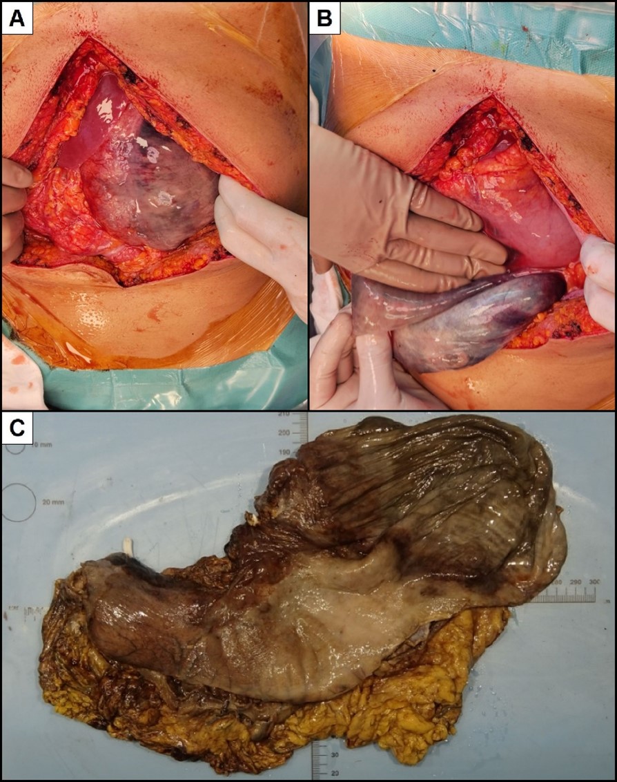 Figura 2: Gastrectomia total - Cirurgia e Peça cirúrgica - Fotografias da cirurgia antes (A) e depois (B) da redução do vólvulo gástrico mesentero-axial mostrando aspetos macroscópicos sugestivos de isquemia gástrica não reversíveis, posteriormente corroborados por avaliação anátomo-patológica da peça cirúrgica (Macroscopia da peça cirúrgica - C).