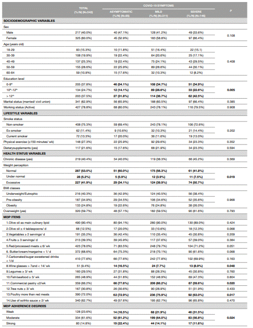 Um total de 542 adultos foram incluídos no estudo, 60,0% do sexo feminino e 53,9% com idade entre 40 e 59 anos. Os dados mostram que 15,7% dos participantes eram assintomáticos para infeção por COVID-19 e 26,9% apresentavam sintomas graves. Uma forte adesão ao Padrão Alimentar Mediterrânico foi encontrada em 14,8% dos participantes, sendo significativamente maior entre os assintomáticos do que naqueles que relataram sintomas leves ou graves. Baixa ingestão de carnes vermelhas/ processadas, gorduras (manteiga/creme ou margarina), pastelaria e refrigerantes/ bebidas açucaradas, assim como o consumo mais frequente de carne de aves do que carne vermelha, foi associada a uma menor gravidade dos sintomas, após ajustado para sexo, idade e escolaridade. Os participantes que relataram consumo adequado de azeite (OR=0,47; IC 95%: 0,25-0,88) e hortícolas (OR=0,57; IC 95%: 0,35-0,94) apresentaram menor probabilidade de ter algum sintoma da doença. Contudo, os resultados não foram consistentes, quando considerados vários itens, associados na análise bivariada e em modelos de regressão logística não ajustados.