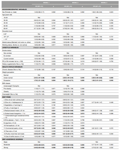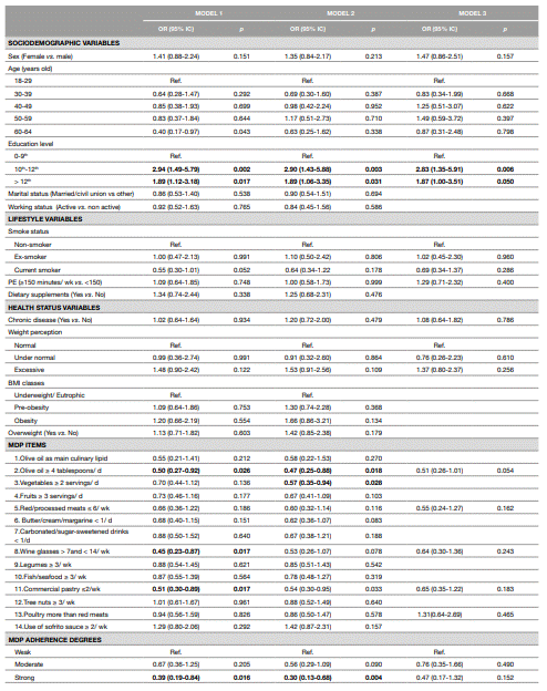 Model 3 - the following variables entered in the model: sex; age; educational level; smoke status; physical exercise; chronic disease; weight perception; MDP items (Olive oil ≥ 4 tablespoons/d; Red/processed meats ≤6/wk; Butter/cream/ margarine 7 and < 14/ wk; Commercial pastry ≤2/wk; Poultry more than red meats); and MDP adherence degrees)