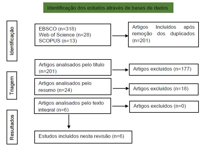 Da pesquisa realizada foram recuperados 201 resultados. Após leitura dos títulos e resumos, posteriormente leitura dos textos completos, foram analisados por três investigadores de forma independente. Finalmente, foi realizada uma análise completa dos seis artigos selecionados. Os resultados são apresentados no fluxograma, que pode ser consultado na Figura 1. Na tabela 1, apresentam-se resumidos os principais resultados de cada artigo analisado.