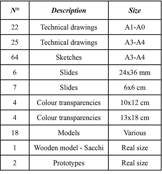 We catalogued and stored the digitized material into the Regione Lombardia database, according to its cataloguing system for cultural heritage: SIRBeC. In particular, all the drawings, intermediate models, and final prototypes have been catalogued as works of art according to the record OA (Opera d’Arte), highlighting the artistic value of such production; while photos, slides and transparencies have been catalogued with the record F (Photographs). Additionally, the system provides a record Design (DES R.L.), linking all the digitized materials, that describes the overall project behind an industrial design product, the related documents, the subsequent restyled editions and the information about the author.