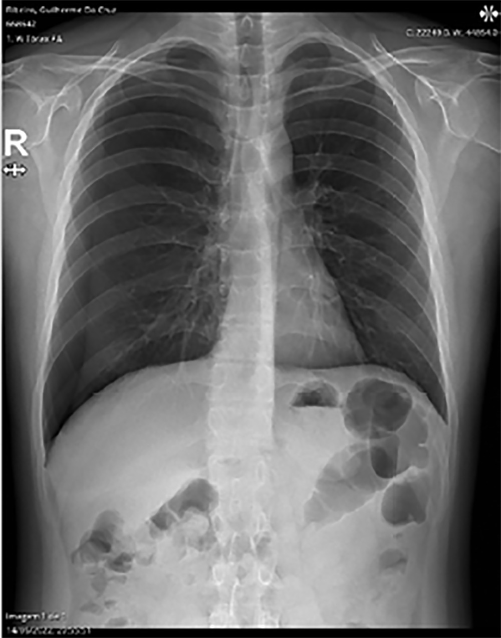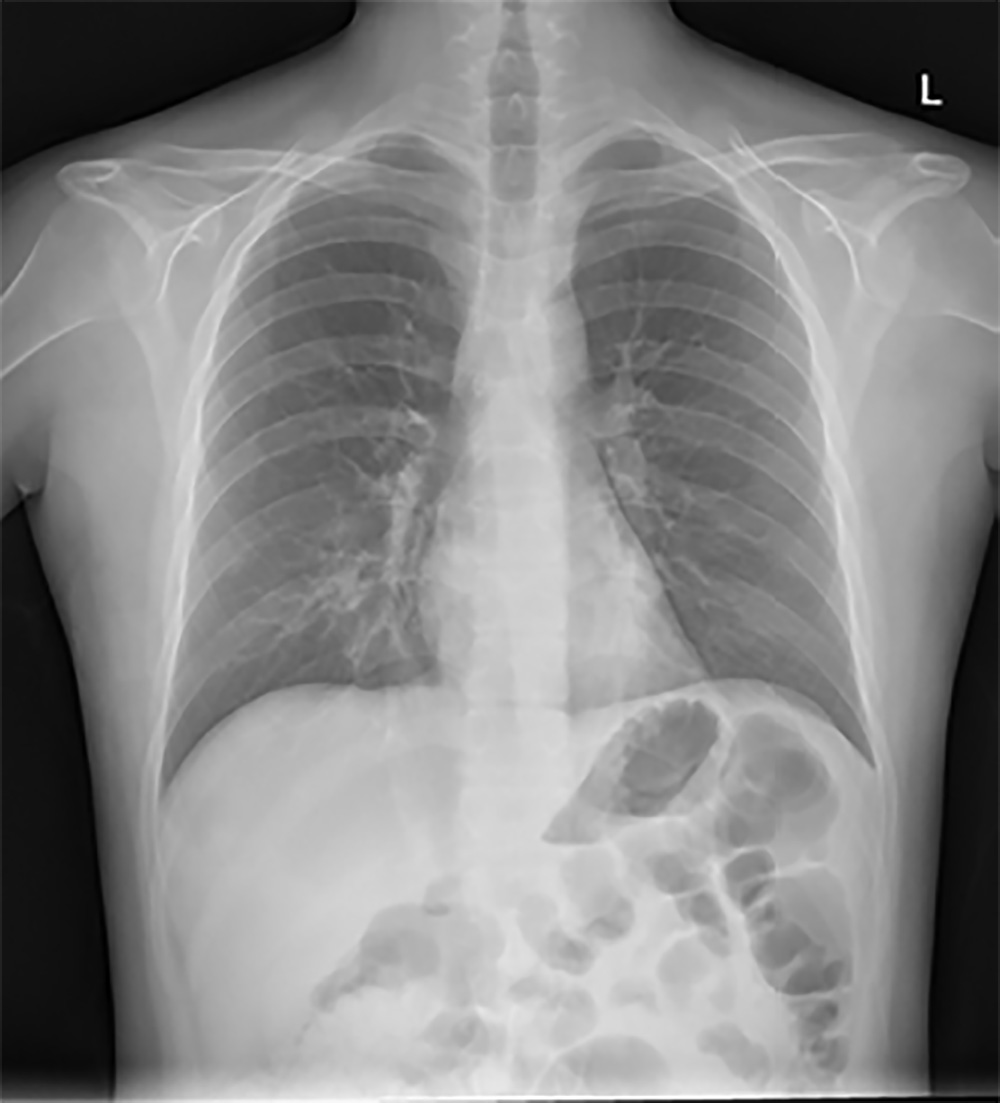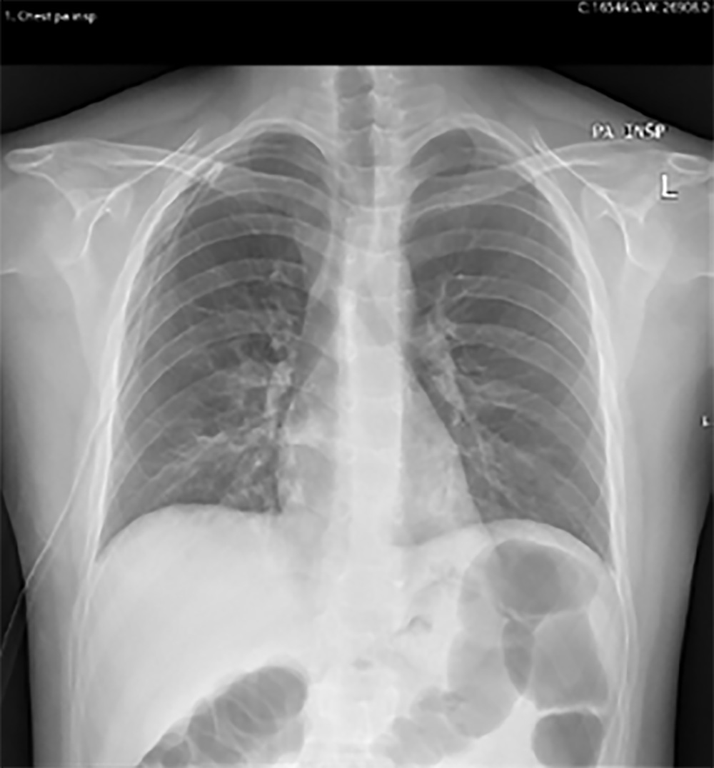 Após este período removeu-se o mesmo e efetuou-se uma radiografia de controlo. A radiografia evidenciou uma resolução completa do pneumotórax (Fig. 3), sendo programada a alta para o próprio dia.