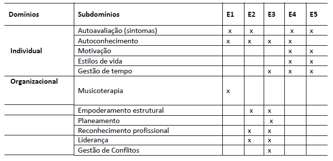 O domínio organizacional deu origem a 6 subdomínios: planeamento; liderança; gestão de conflitos; empoderamento estrutural; reconhecimento profissional e musicoterapia. Por sua vez, o domínio Individual originou 5 subdomínios: autoavaliação (sintomas); autoconhecimento; motivação; gestão de tempo e estilos de vida.