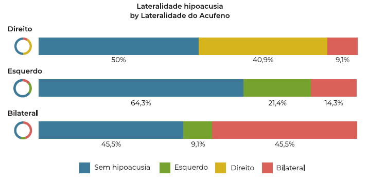 Verificou-se uma correlação estatisticamente significativa entre lateralidade de acufeno e lateralidade de hipoacusia (p=0,002). 45% dos acufenos bilaterais acompanhavam-se de hipoacusia bilateral, todos os casos de hipoacusia direita ocorreram em casos de acufeno direito, e 75% (4) dos casos de hipoacusia esquerda foram diagnosticados em doentes com acufeno esquerdo.