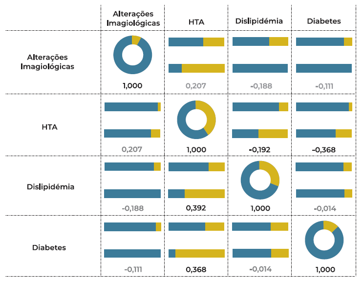 Figura 3 Matriz de correlação entre alterações imagiológicas e fatores de risco cardiovasculares. HTA - hipertensão arterial. Valores são coeficientes de correlação tetracórica