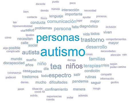 Por otro lado, durante la pandemia se han publicado vídeos dirigidos a niños con autismo. En uno de ellos (https://www.youtube.com/watch?v=l9LVyNIOct0) se explican algunas pautas para sobrellevar el confinamiento con niños con TEA. Por ejemplo, explicarles con pictogramas o cuentos qué es el Coronavirus, enseñarles a lavarse las manos para prevenir el virus, intentar mantener las rutinas y ritmos de sueño y alimentación. También, en una noticia se explica qué significa el pañuelo azul que llevan algunos niños. Algunos padres de niños con autismo han relatado como han sido amenazados por sus vecinos por salir a la calle durante la emergencia sanitaria. Por ello, en redes sociales, ha surgido una iniciativa para identificar a estas personas, ya que necesitan salir frecuentemente a la calle, lo que no siempre es bien recibido. En esta línea, también aparecen noticias sobre el miedo de los niños con autismo y sus familias, sobre salir a la calle.
