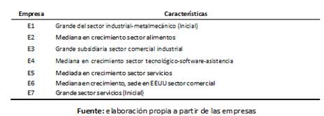Las observaciones se realizaron durante cuarenta y dos meses en diez organizaciones de Barranquilla; sin embargo, se hicieron entrevistas a nueve directivos en siete empresas del sector privado (Cuadro 1). Los nombres de empresas y participantes se mantienen en confidencialidad. Las primeras entrevistas se realizaron en las dos primeras empresas abordadas (E1 y E7); luego se procesaron y con base en esos resultados, se vincularon paulatinamente otras empresas, hasta saturar categorías en la séptima.